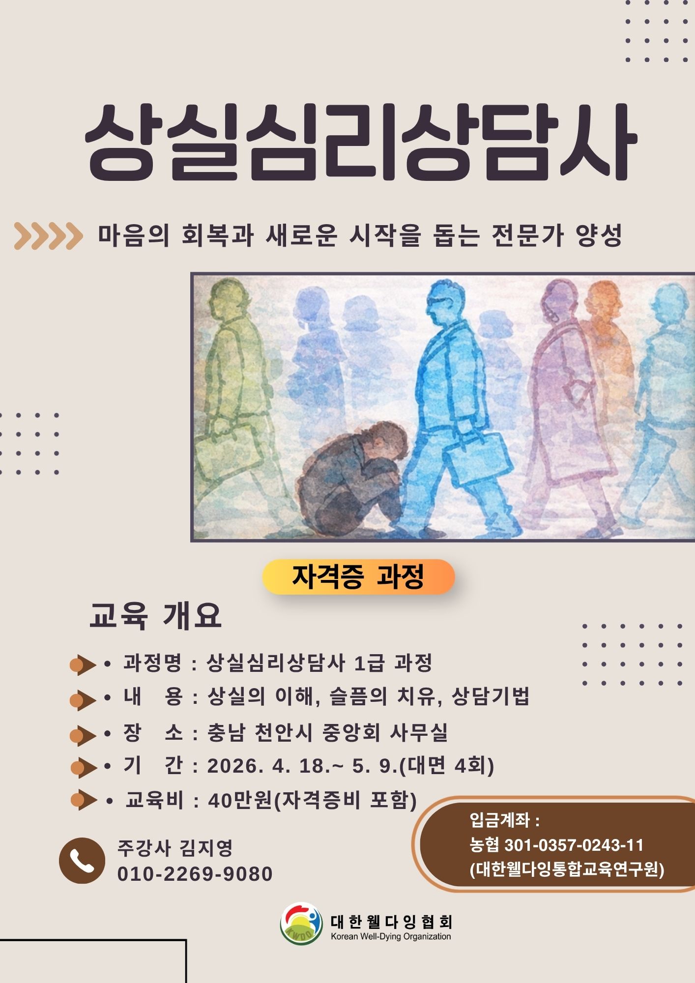 마음의 회복과 새로운 시작을 돕는 상실심리상담사 전문가 양성과정으로 많은 분들의 관심과 참여바랍니다.