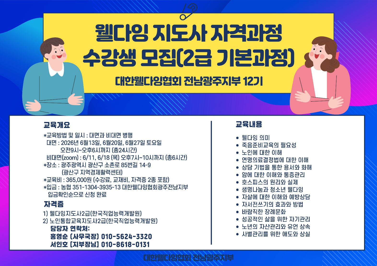 대한웰다잉협회 전남광주지부에서는 12기 웰다잉지도사(2급)자격과정 수강생을 모집합니다.