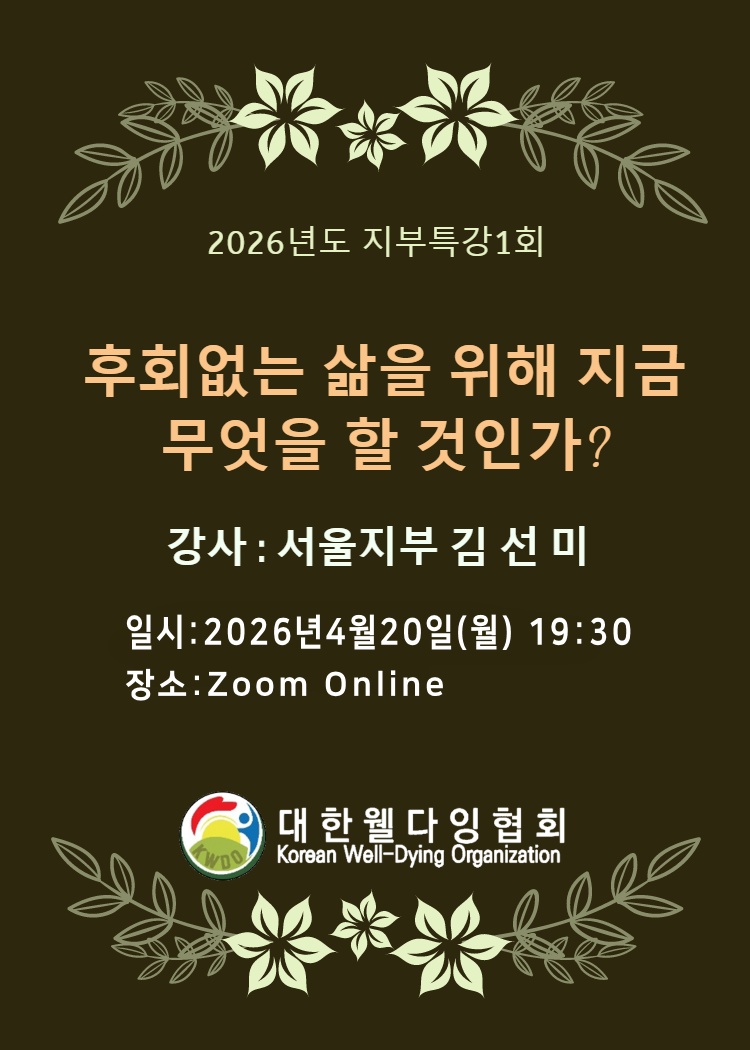 대한웰다잉협회는 웰다잉문화확산의 일환으로 매월 비대면 줌으로 웰다잉 특강을 시행하고 있습니다.
